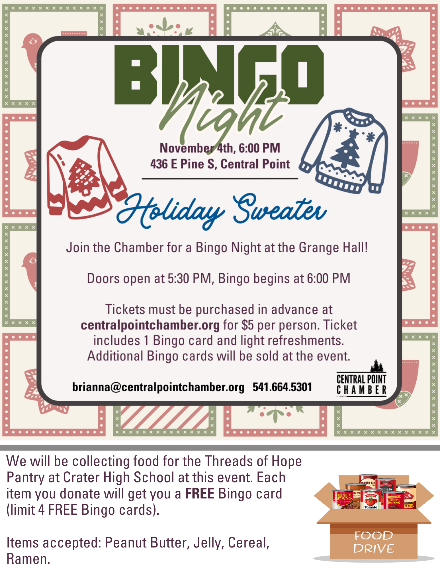 Fall Bingo, Tuesday, November 4th, 2025, at the Central Point Grange Hall #698, located at 436 E Pine St. Doors open at 5:30 PM, Bingo begins at 6 PM. Our Fall Bingo theme is “Holiday Sweaters”!