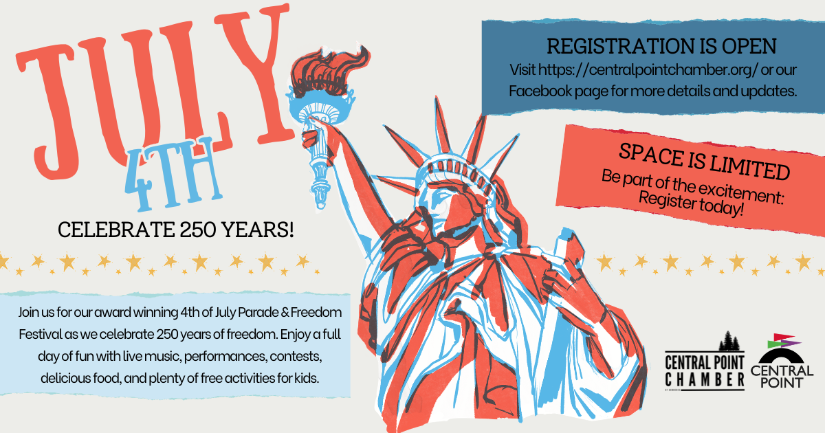The Central Point 4th of July Parade and Freedom Festival is our city’s proudest celebration of freedom, community, and family fun. This year we are going bigger than ever to celebrate America’s 250th! Enjoy a full day of activities, including our award-winning parade, a lively festival at Robert Pfaff Park, free children’s activities, and a spectacular fireworks show. We warmly welcome artists, businesses, food and confection vendors, entertainers, and more from across the Rogue Valley to join us. We are excited to celebrate with you! Click the buttons below to register for the Parade and Freedom Festival and be part of this unforgettable day.